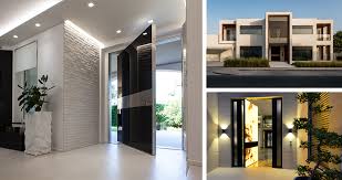 Modern Appeal: Pivot doors with large glass panels or sleek, minimalist wood doors in horizontal or vertical grain patterns create a contemporary aesthetic perfect for modern villas.